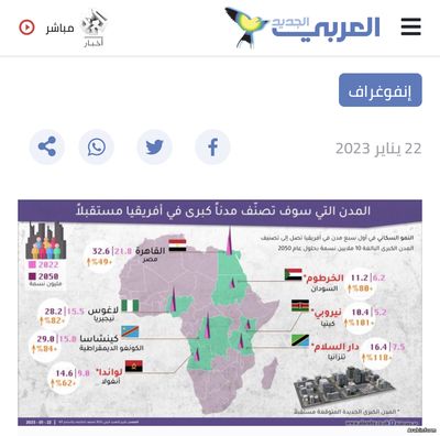 В настоящее время в Африке три крупных мегаполиса: Каир в Египте с населением более 21 млн человек, Киншаса в Демократической Республике Конго с 15.8 млн и Лагос в Нигерии с 15.5 млн человек, данные приводит газета AlArabi. Ожидается, что к 2050 году на континенте появятся еще четыре города с населением более 10 млн человек, в том числе Дар-эс-Салам в Танзании, Найроби в Кении, Хартум в Судане и Луанда в Анголе. @Arabinform |