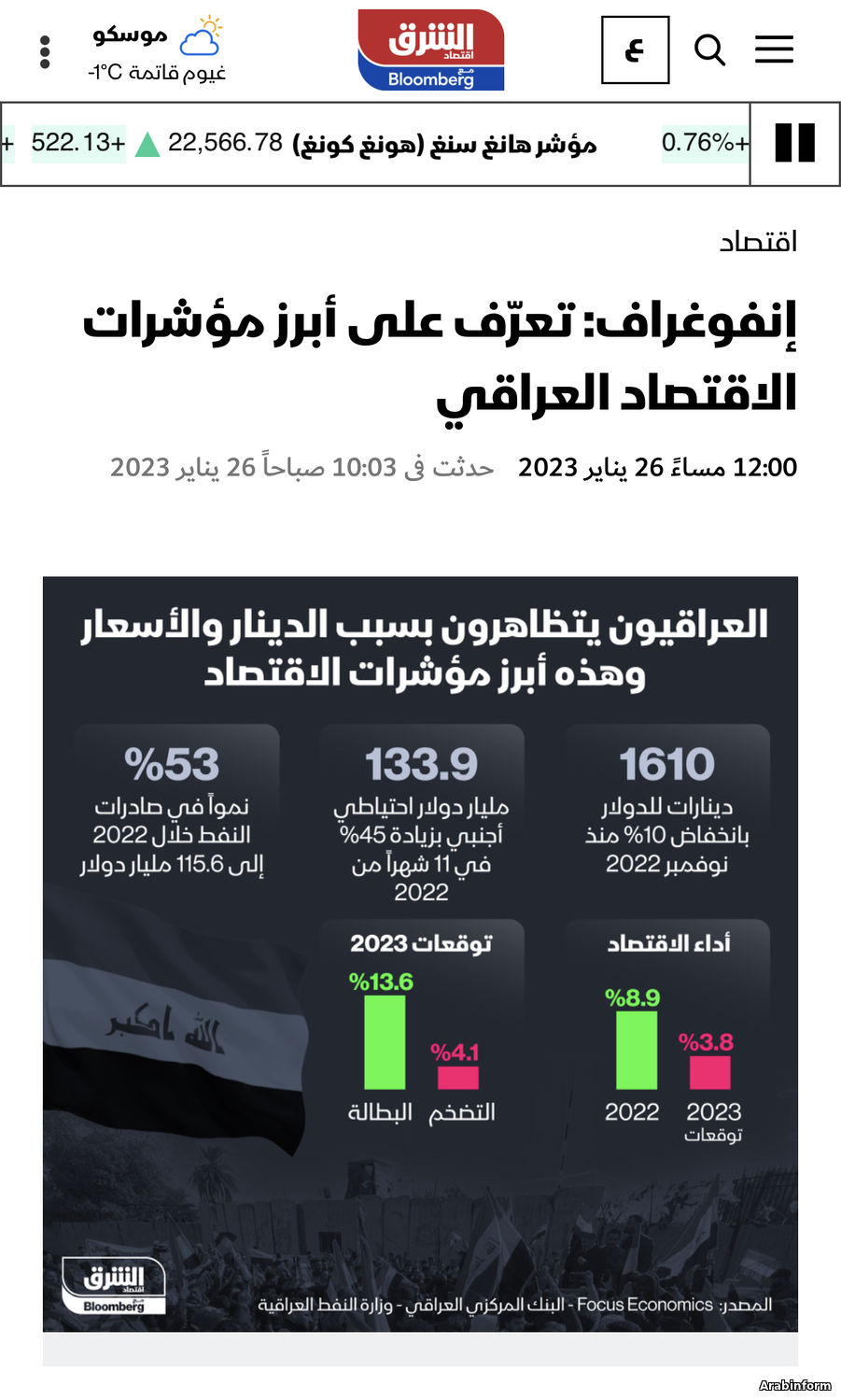 В 2022 году экономика Ирака выросла на 8,9 %. По прогнозам в этом году ожидается рост на уровне 3,8 %, пишет Asharq News. Уровень инфляции достигнет 4,1 %, а безработицы 13,6 %. На конец прошлого 2022 года валютные резервы страны составили 133,9 млрд долларов, увеличившись на 45 %. Рост экспорта нефти 53 %. @Arabinform |