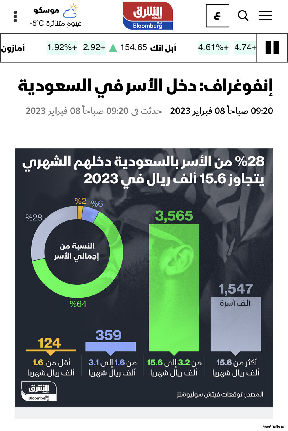 Доход около 64 % семей в Саудовской Аравии составляет от 3,2 до 15,6 тыс. риалов в месяц, что примерно 850-4150 долларов, данные приводит Asharq News. Доход 28 % семей превышает 15,6 тыс. риалов в месяц, 6 % получают от 1,6 до 3,1 тысяч риалов или от 420 до 820 долларов. @Arabinform |