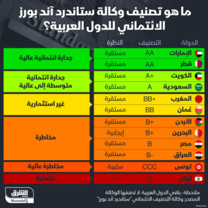 Высокая кредитоспособность (наивысшего качества)- ОАЭ, Катар; Выше среднего качества - Кувейт, Саудовская Аравия; Неинвестиционный рейтинг (ниже среднего качества) - Марокко, Оман; В высокой степени спекулятивный - Иордания, Бахрейн, Египет, Ирак; Очень высокий кредитный риск, близки к дефолту - Тунис; Дефолтный - Ливан. @Arabinform