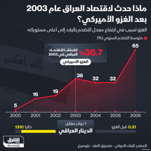Вторжение США в Ирак 20 лет назад привело к серьезным экономическим последствиям для иракской экономики и общества, наиболее заметным из которых стал высокий уровень инфляции, пишет Asharq News. К моменту вторжения инфляция в стране с 2000 года выросла с 5 до более 36 % годовых, а спустя три года и вовсе превысила 60 %. Курс иракского динара до вторжения составлял 0,31 динара за один американский доллар, после 1310 динаров за доллар. @Arabinform |