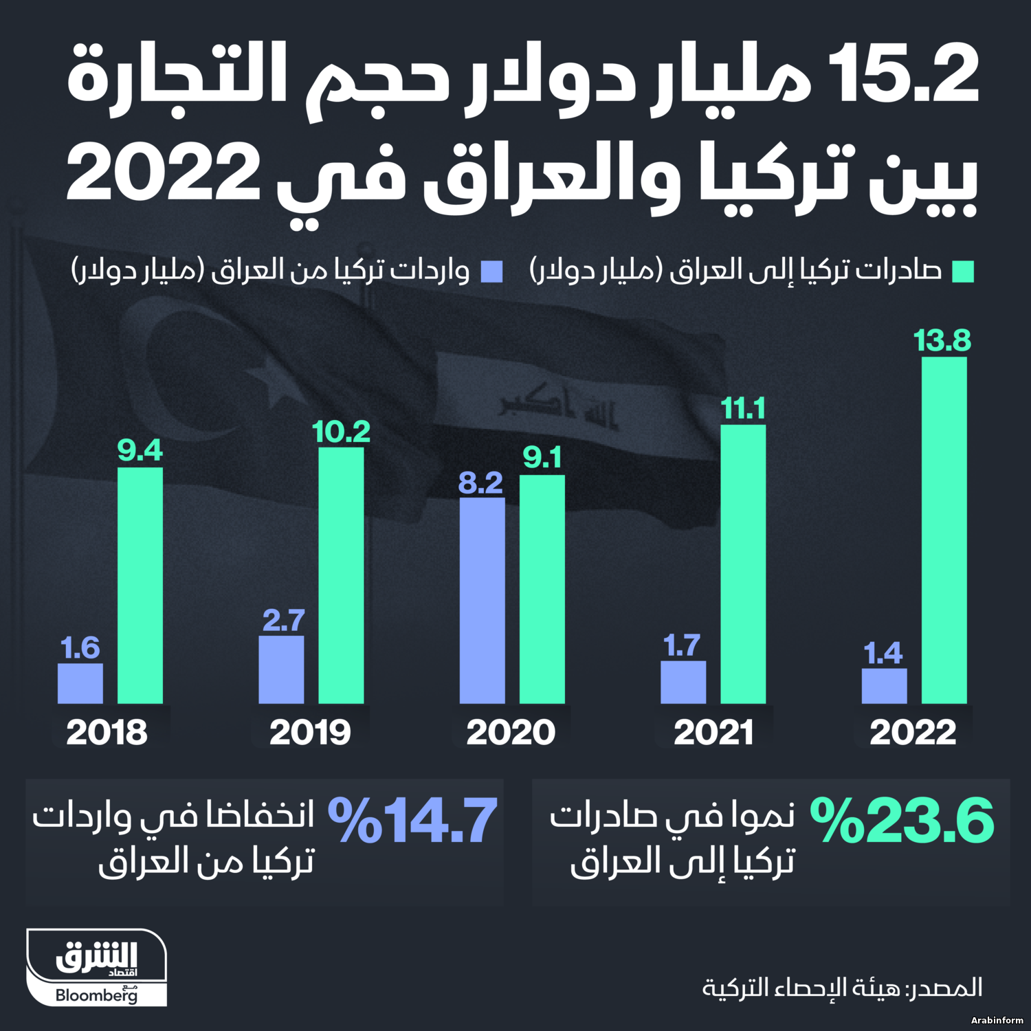 Объем товарооборота между Ираком и Турцией достиг 15,2 млрд долларов в 2022 году по сравнению с 12,8 млрд долларов в 2021 году. Так, экспорт Турции в Багдад вырос на 23,6 % до рекордных 13,8 млрд долларов, а экспорт Ирака в Стамбул увеличился на 14,7 % до 1,4 млрд долларов. @Arabinform |