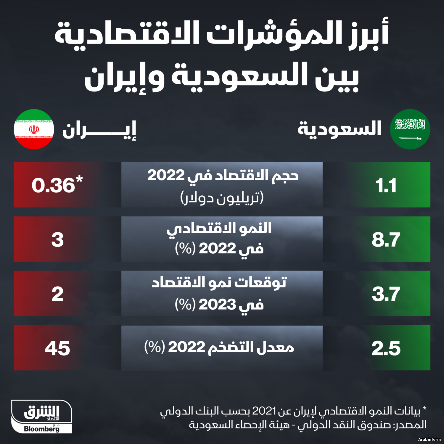 | Саудовская Аравия и Иран согласовали возобновление дипломатических отношений и открытие своих посольств и представительств в течение максимум двух месяцев, пишет Asharq News. Следует отметить, что дипломатические отношения между двумя странами, входящими в Организацию стран-экспортеров нефти (ОПЕК), были разорваны в 2016 году. Товарооборот между Саудовской Аравией и Ираном в последние годы с 2016 года был нулевой. Одновременно с этим, размер экономики Саудовской Аравии в прошлом году достиг $1,1 трлн против $0,36 трлн экономики Ирана (по данным Всемирного банка за 2021 год). За 2022 год экономика Саудовской Аравии выросла на 8,7 % по сравнению с 3 % экономики Ирана. Уровень инфляции в Саудовской Аравии держится на уровне 2,5 %, иранской - 45 %. @Arabinform Еще больше новостей в нашем и VK странице |